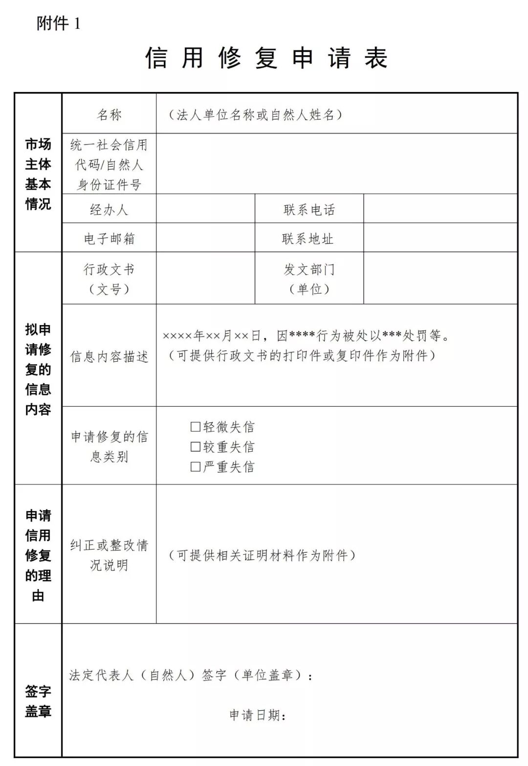 第七条 能源行业市场主体申请信用修复,应通过“信用能源”网站填写《信用修复申请表》和《信用承诺书》,并下载打印、加盖公章后扫描上传。运行单位应即时将申请材料分发至失信信息认定单位。